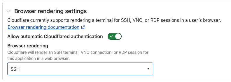 如果有使用GCP Virtual Machine的經驗,會發現GCP有提供網頁版的SSH介面讓你可以快速操作伺服器,Cloudflare有也提供類似服務,找到 Browser rendering settings 並根據下圖設定: